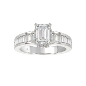LADIES RING 3CT ROUND/EMERALD/BAGUETTE DIAMOND 14K WHITE GOLD (CENTER STONE EMERALD DIAMOND 2.00CT)
