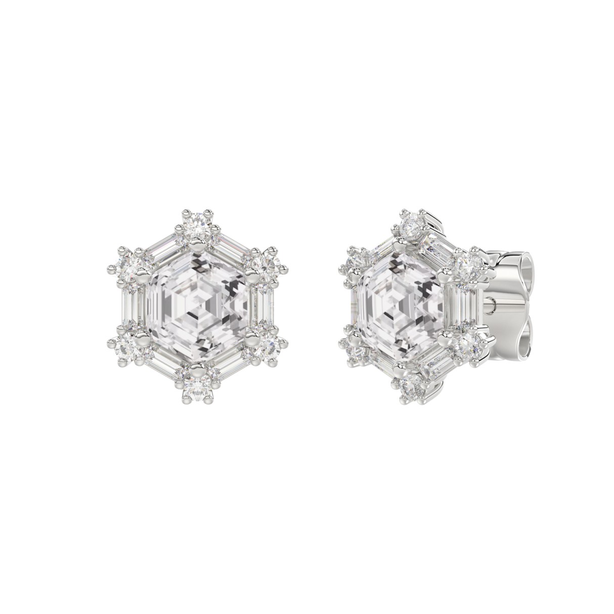 14K WHITE GOLD 1 1/4CT ROUND/BAGUETTE/HEZAGON STEP CUT DIAMOND LADIES EARRINGS