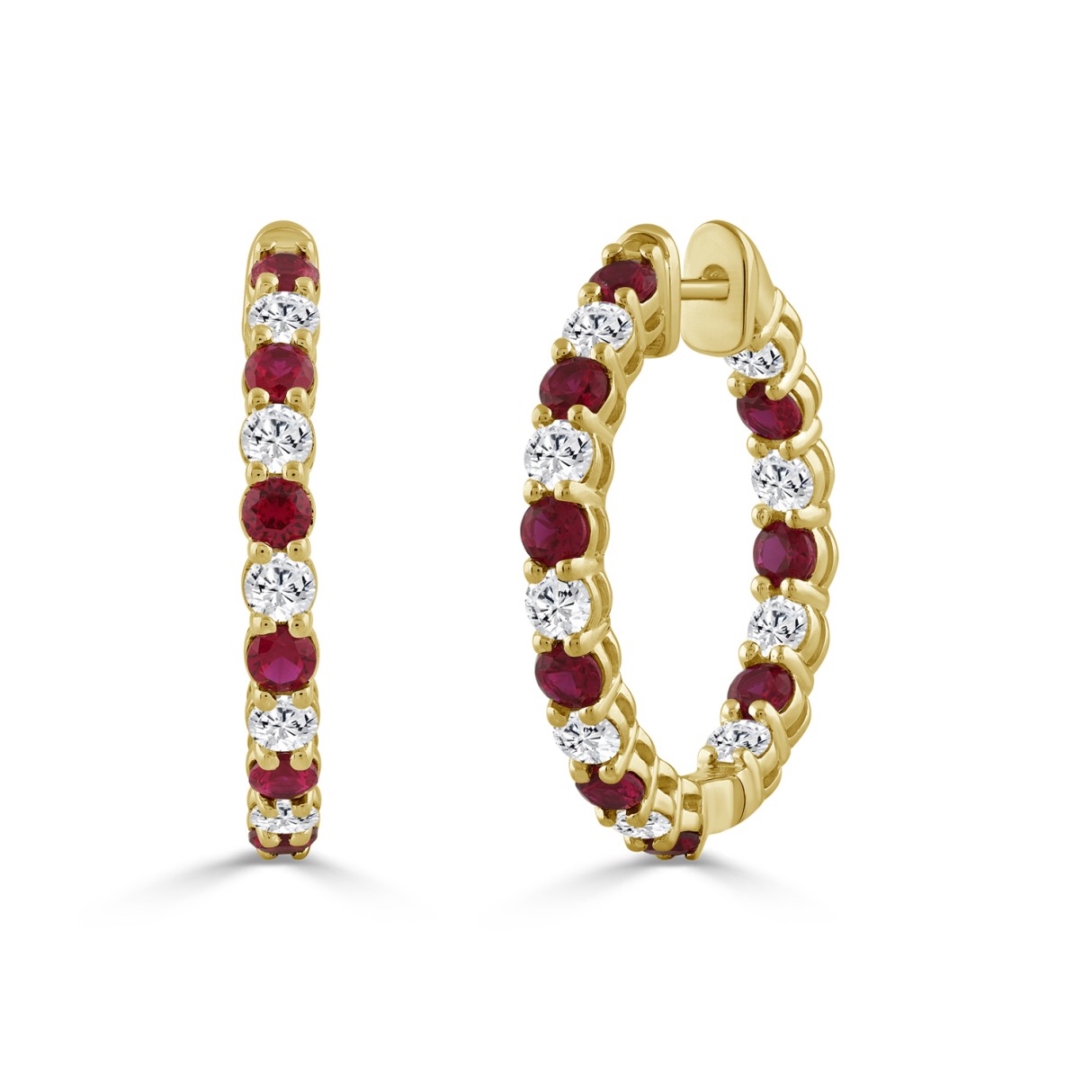 14K YELLOW GOLD 3 3/8CT ROUND/RUBY ROUND DIAMOND LADIES HOOPS EARRING