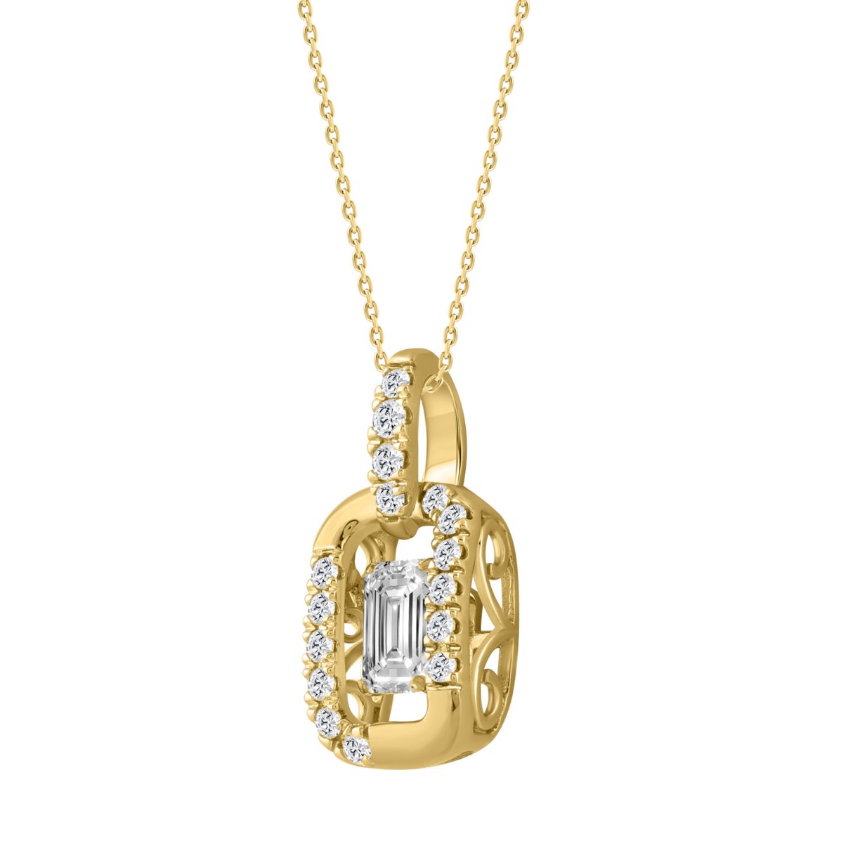 14K YELLOW GOLD 3/4CT ROUND/EMERALD DIAMOND LADIES PENDANT WITH CHAIN (CENTER STONE EMERALD DIAMOND 1/2CT)