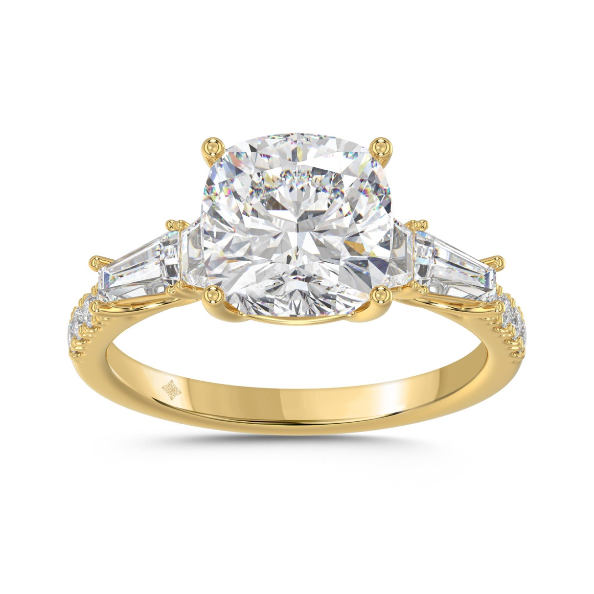 14K YELLOW GOLD 4.00CT ROUND/CUSHION/TRAPEZOID/HALF TAPER BAGUETTE DIAMOND LADIES RING (CENTER STONE CUSHION DIAMOND 3CT)
