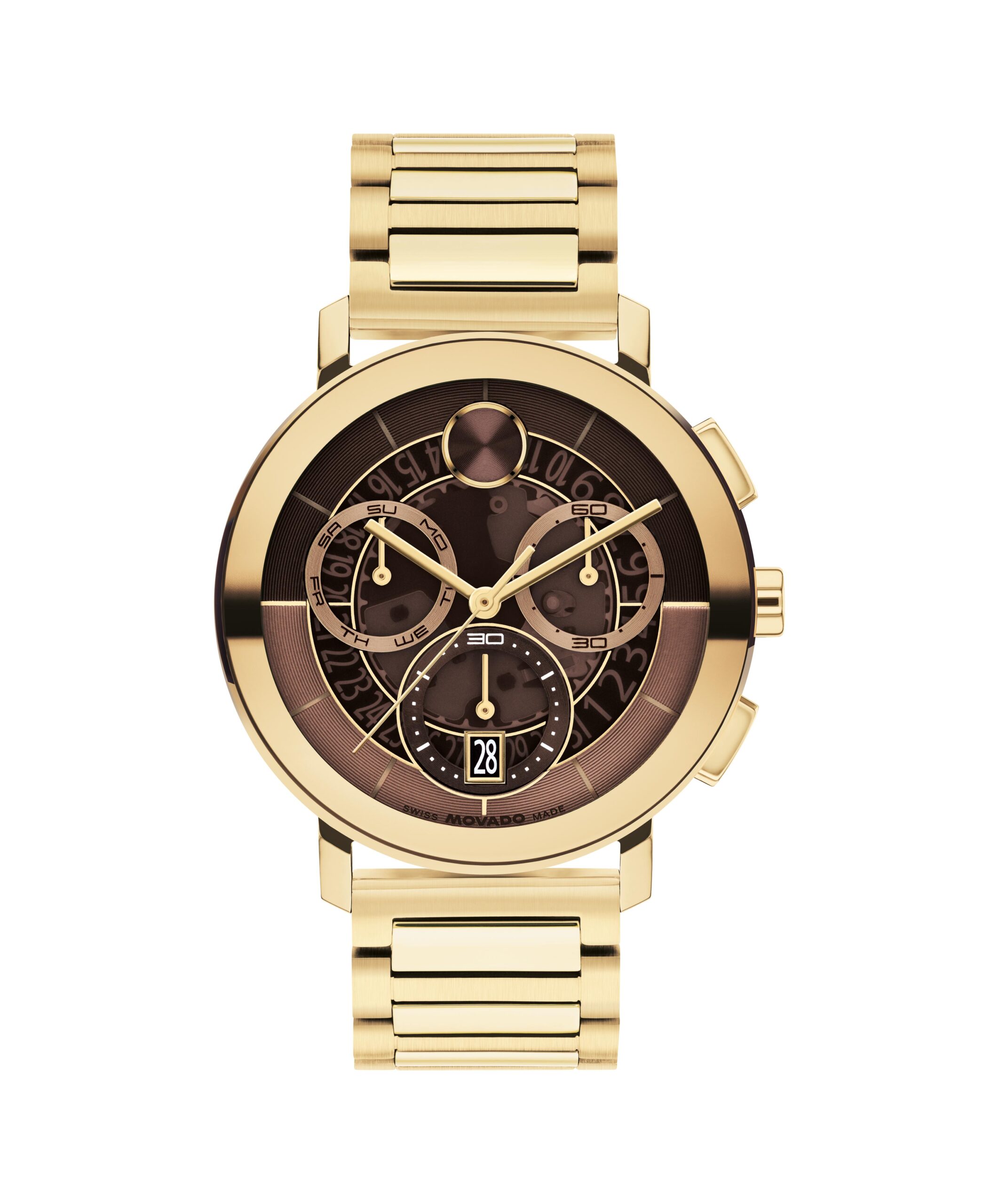 This 42mm chronograph watch features a transparent coffee brown dial with yellow gold tone subdials, slim hands, and our signature dot at 12 o’clock.