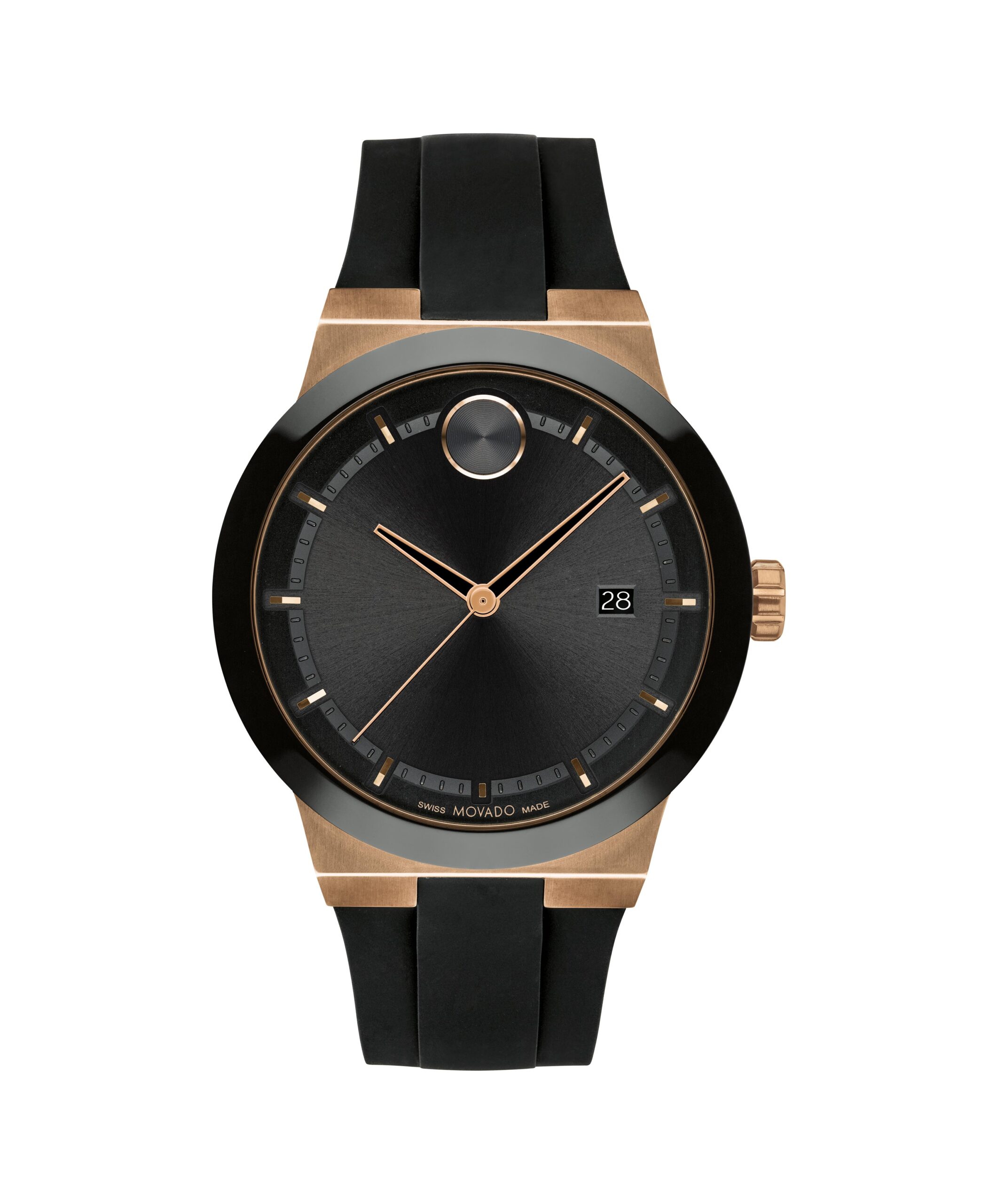 Movado BOLD Fusion, 42mm bronze ion-plated stainless steel case & black ceramic bezel with a black-toned dial on black silicone strap.