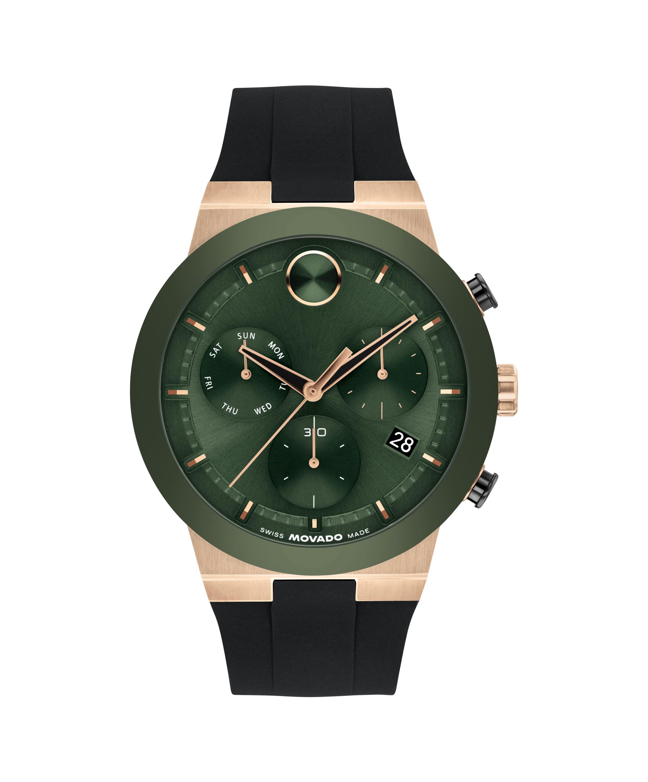 This 44mm chronograph watch features a green sunray dial, ceramic bezel, and a black silicone strap.