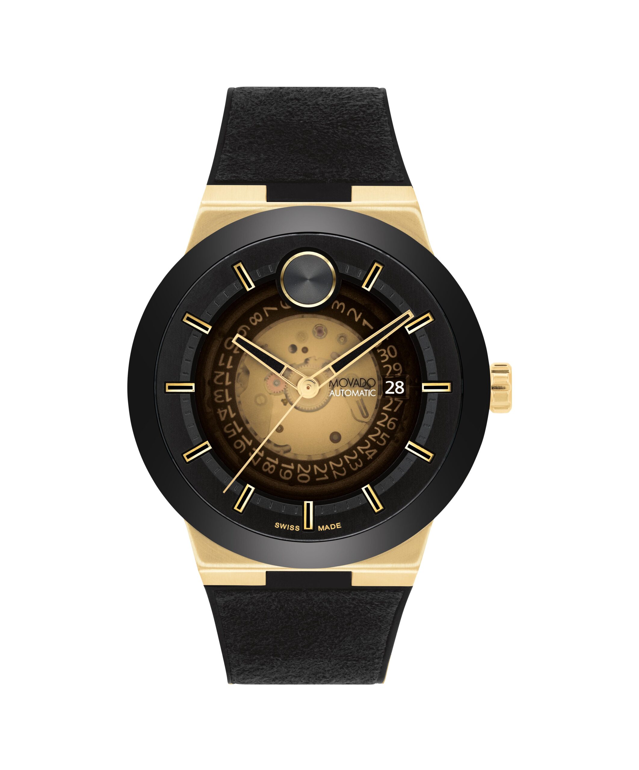 A Swiss made automatic movement drives this watch, powered by the motion of your wrist. This 44mm watch features a black exhibition dial with a yellow goldtone centerzone, Swiss Super-LumiNova accents, and an exhibition case back. Automatic watches do not contain batteries. They are charged by the movement of your wrist. If the watch is not worn it will stop running in about 38 hours. To get it started, turn the crown clockwise about 20-30 times until the second-hand starts moving. You will most likely need to reset the time and date.