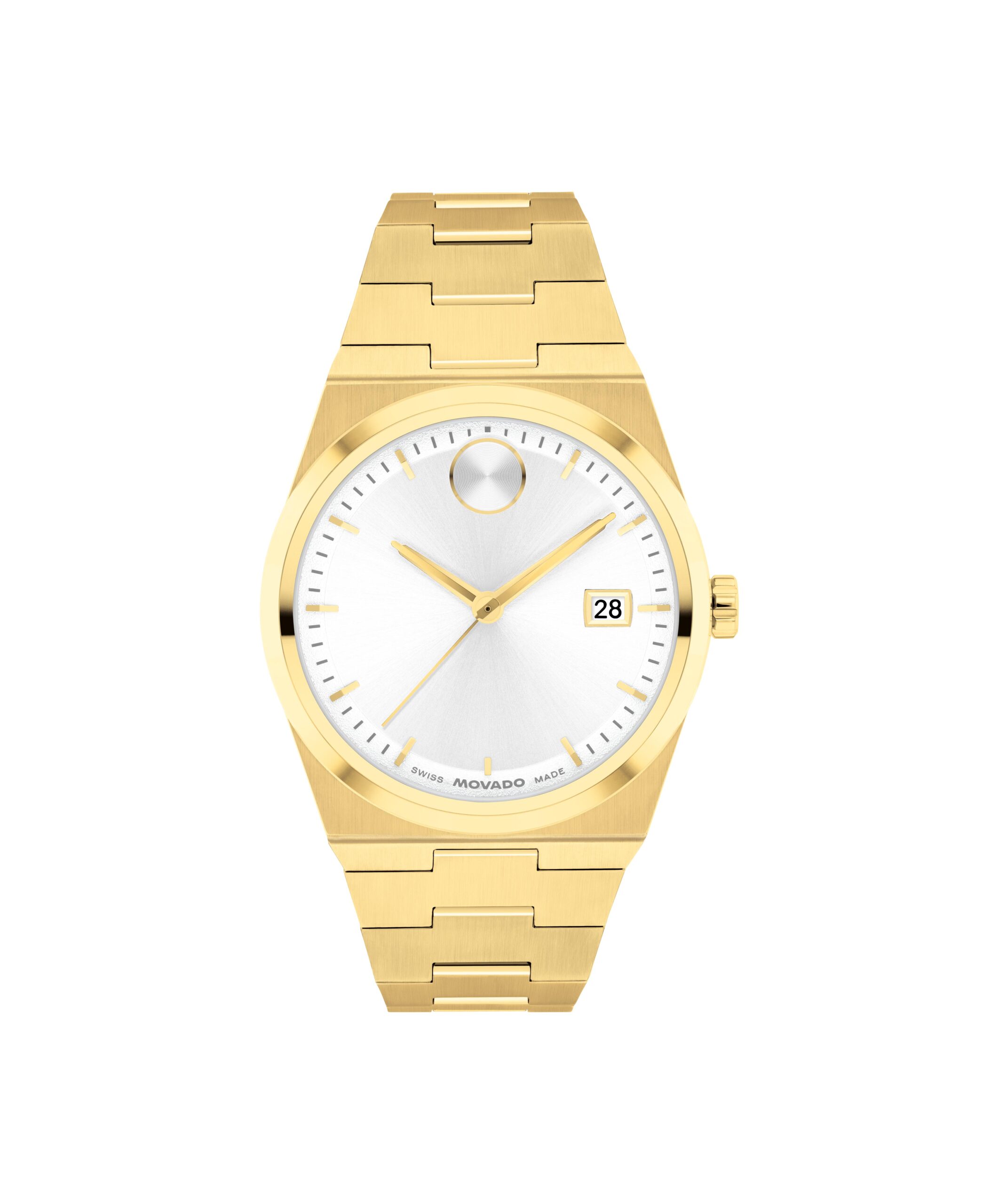 This 35mm watch features a white dial, yellow gold-tone hands, and our signature dot at 12 o’clock.