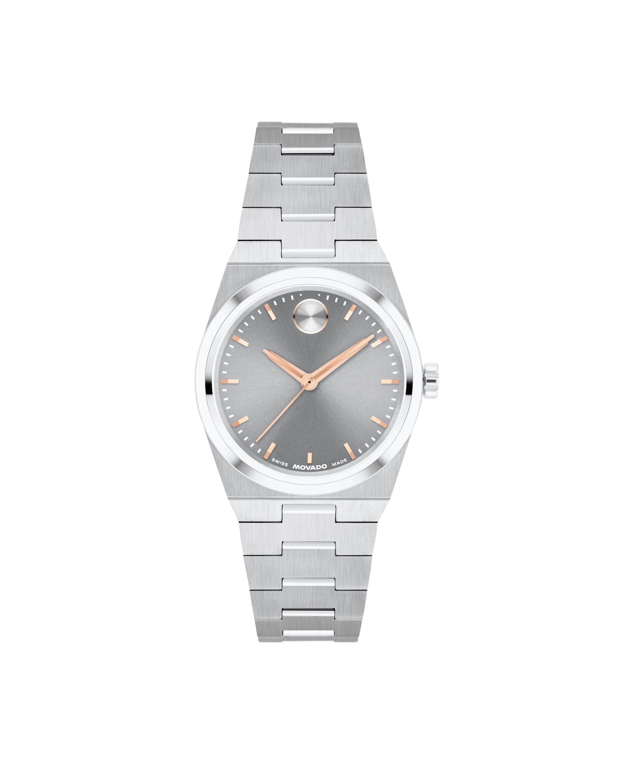 This 28mm watch features a mid grey sunray dial, rose gold tone hands, and our signature dot at 12 o’clock.