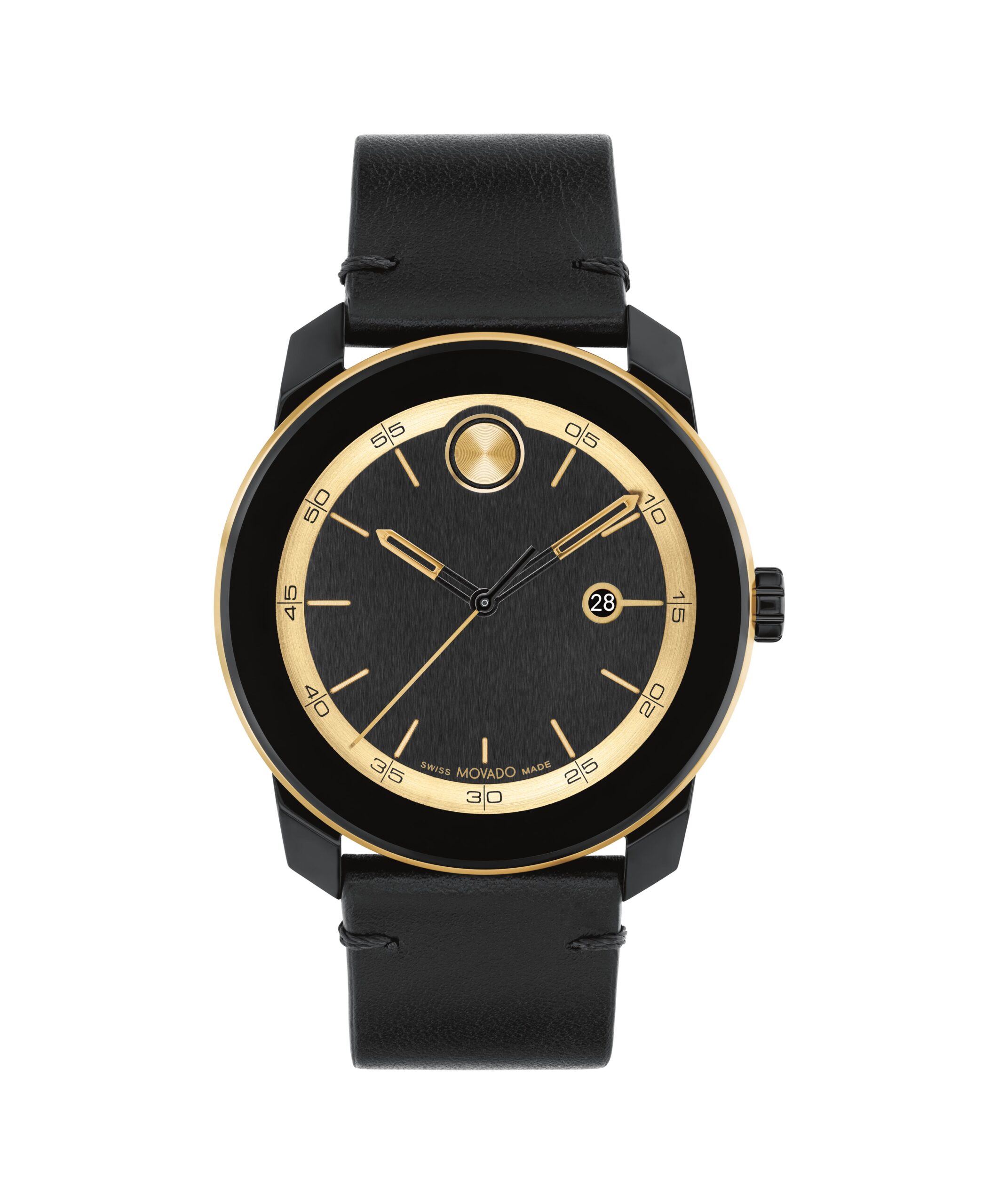 Ultra-modern design defined by pops of color and sporty style. Go cool and contemporary in this black TR90 timepiece with pale yellow goldtone accents. The 42mm case houses a black dial with black Swiss Super-LumiNova accents and a date window. A luxe black leather strap completes the design.