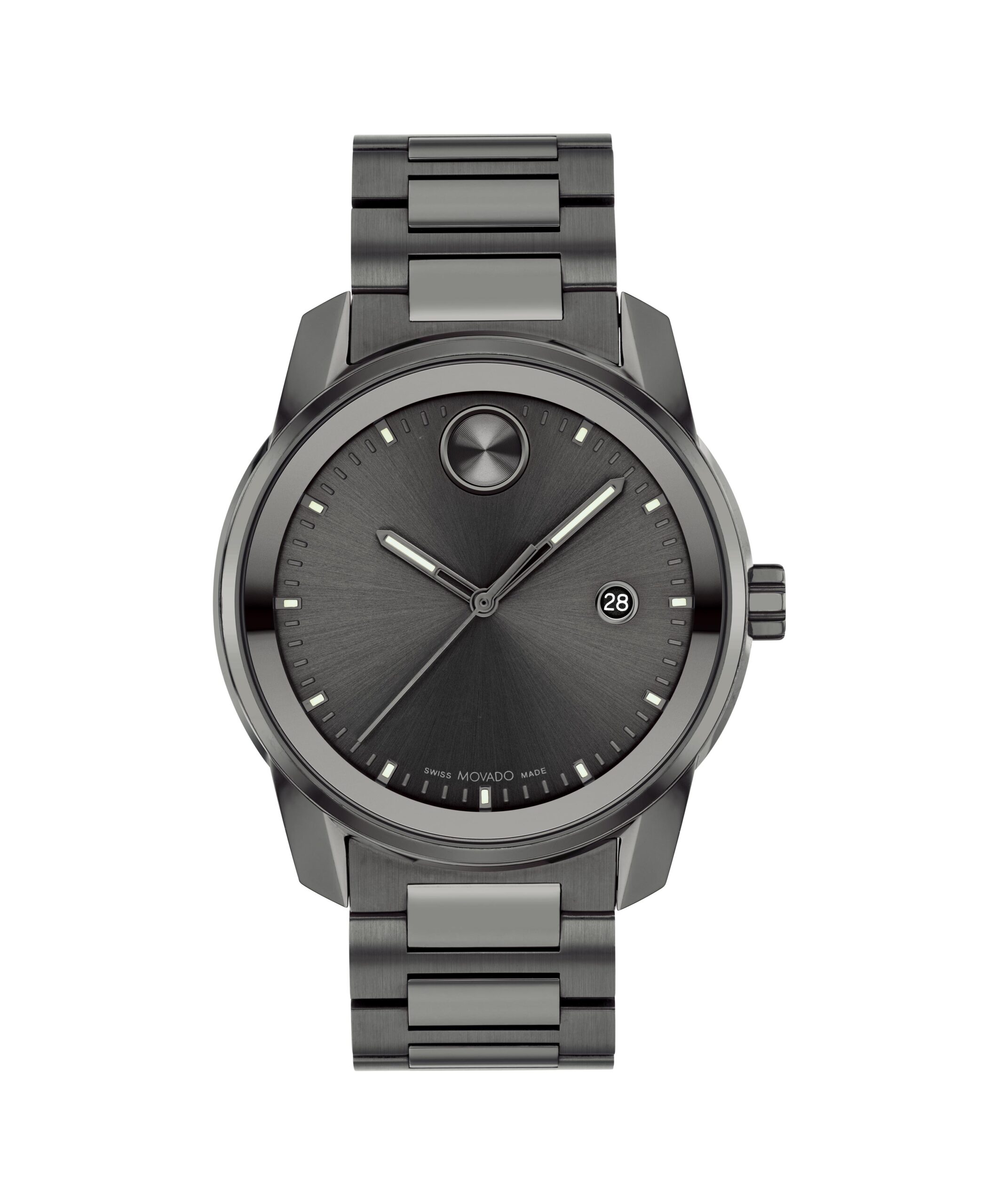 Movado BOLD Verso, 42mm gunmetal ion-plated stainless steel case and bracelet with gunmetal metallization. Features a gunmetal-toned dial, Swiss Super-LumiNova® accents, and date window detailing.