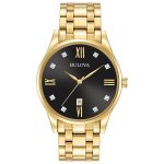 From the Diamonds Collection. New 8-diamond black dial, gold-tone stainless steel case and bracelet with double-press deployment closure, three-hand calendar, and flat mineral glass.
