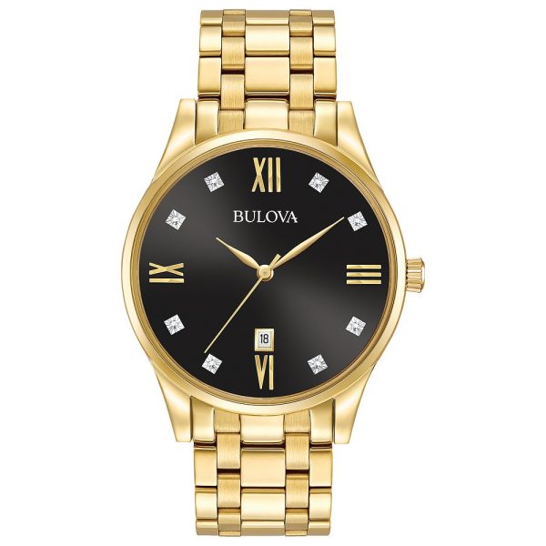 From the Diamonds Collection. New 8-diamond black dial, gold-tone stainless steel case and bracelet with double-press deployment closure, three-hand calendar, and flat mineral glass.