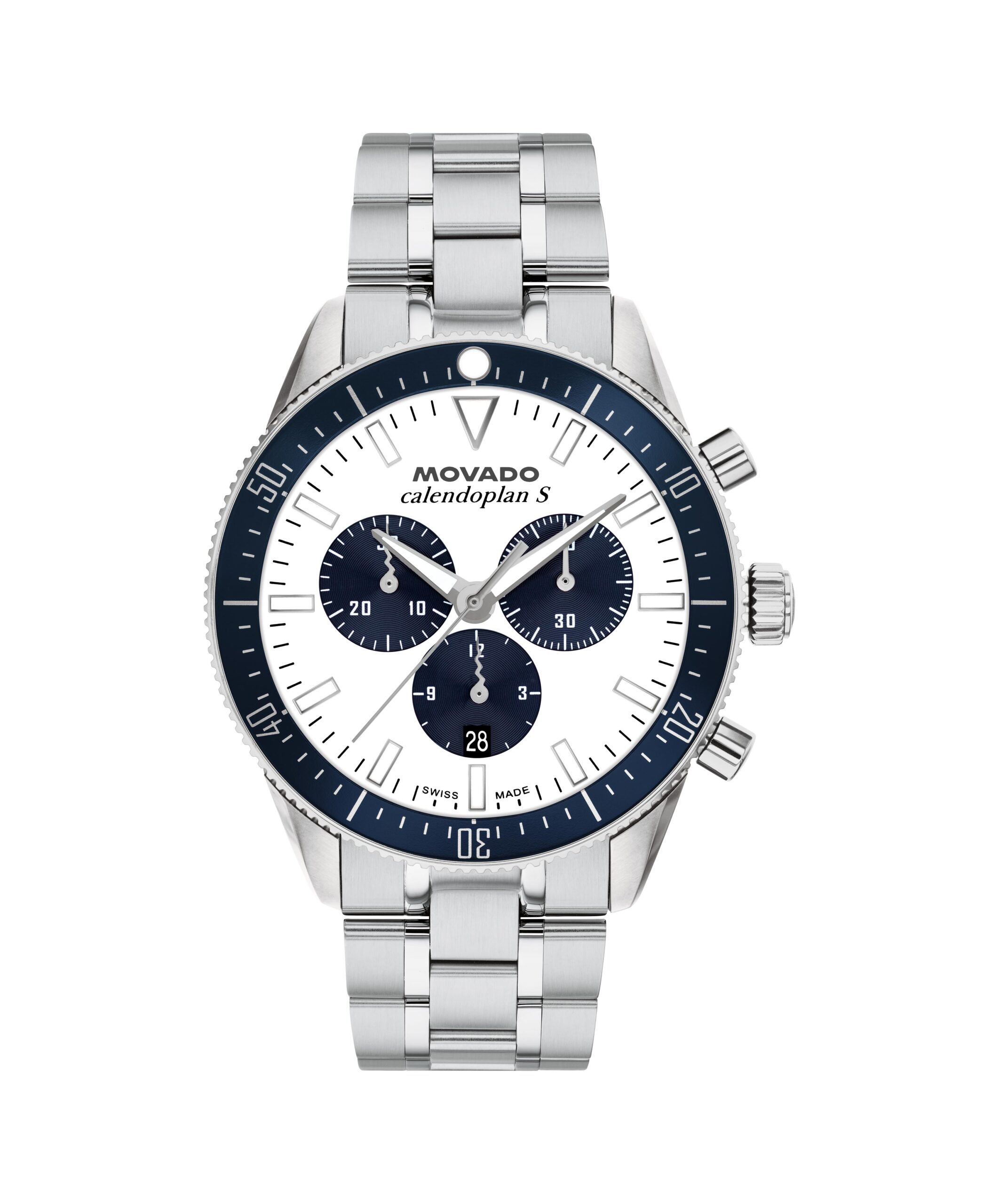 This 42mm chronograph watch features a white lacquer dial, Swiss Super-LumiNova accents, and a blue aluminum bezel.