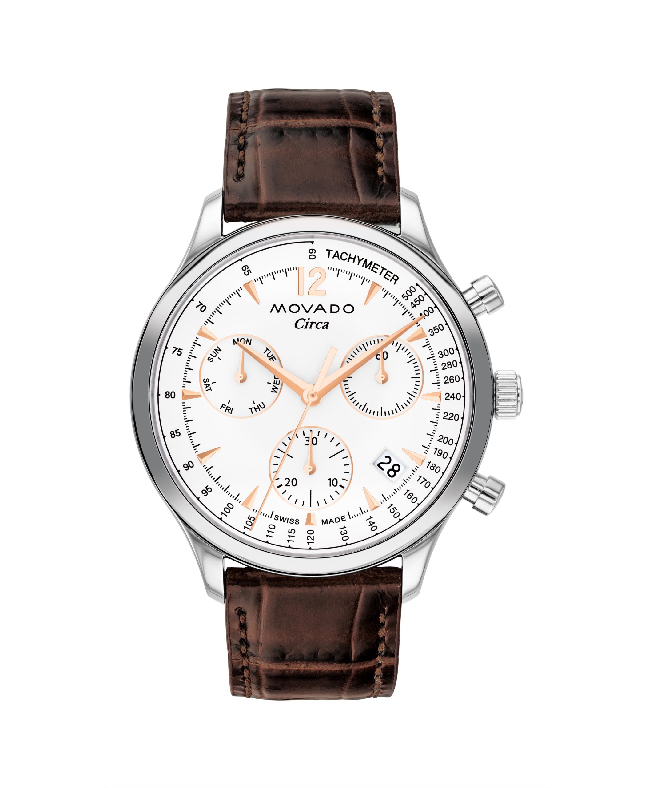 Movado Heritage Series Circa, 43mm stainless steel case with white chronograph dial on brown faux crocodile leather strap.