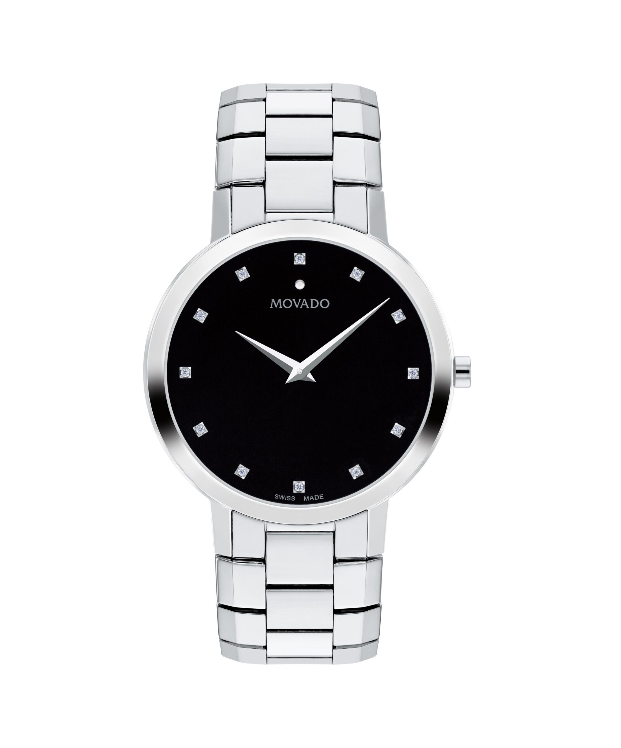 This 39mm watch features a black enamel dial with diamond hour markers, and steel dauphine hands.