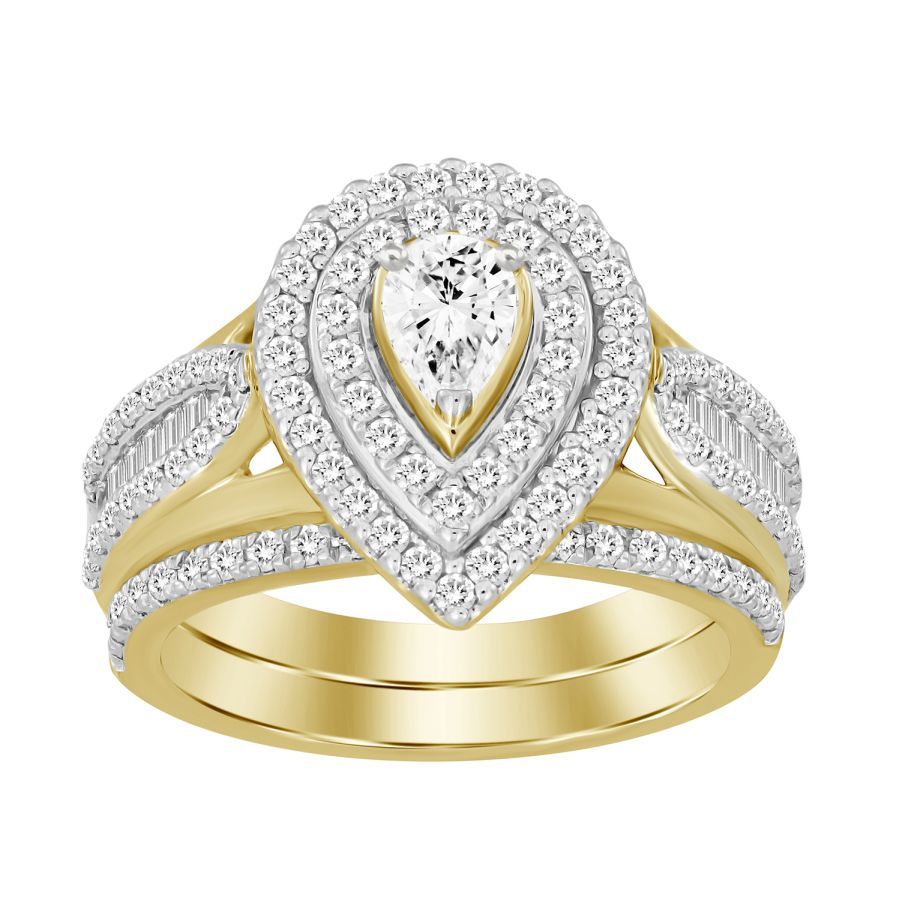 LADIES BRIDAL SET 1.00CT ROUND/BAGUETTE DIAMOND 14K YELLOW GOLD (CENTER STONE 0.20 CT PEAR DIAMOND)