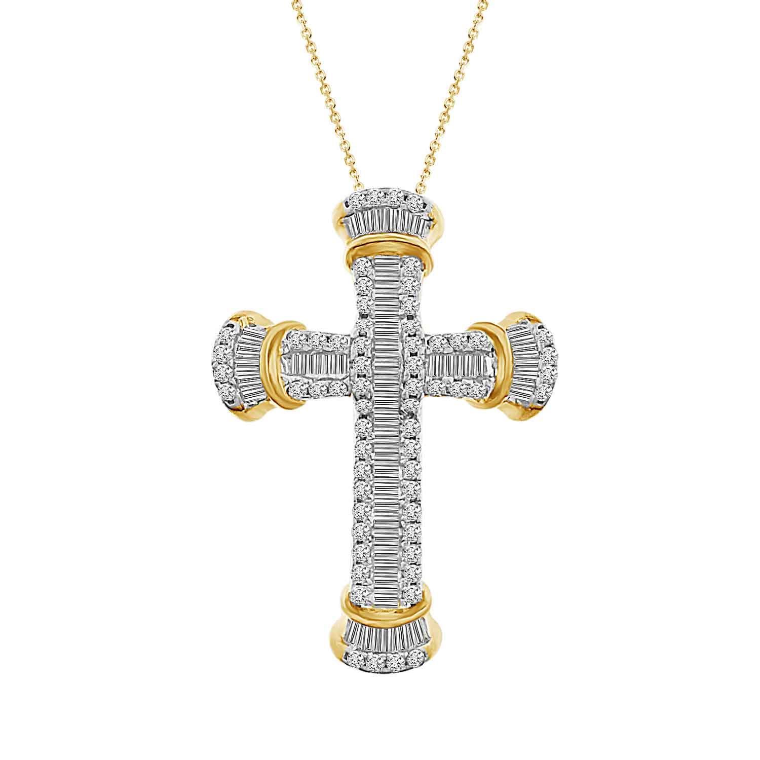 LADIES CROSS PENDANT 0.50CT ROUND/BAGUETTE DIAMOND 10K YELLOW GOLD