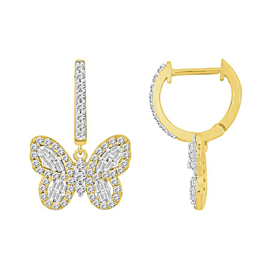 LADIES EARRINGS 0.75CT ROUND/BAGUETTE DIAMOND 14K YELLOW GOLD (SI QUALITY)