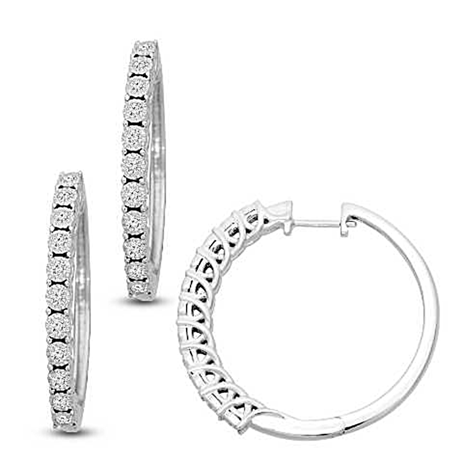 LADIES HOOP EARRINGS 1.50CT ROUND DIAMOND 10K WHITE GOLD