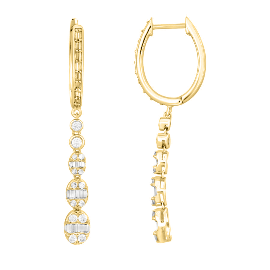 LADIES HOOP EARRINGS 0.75CT ROUND/BAGUETTE DIAMOND 14K YELLOW GOLD