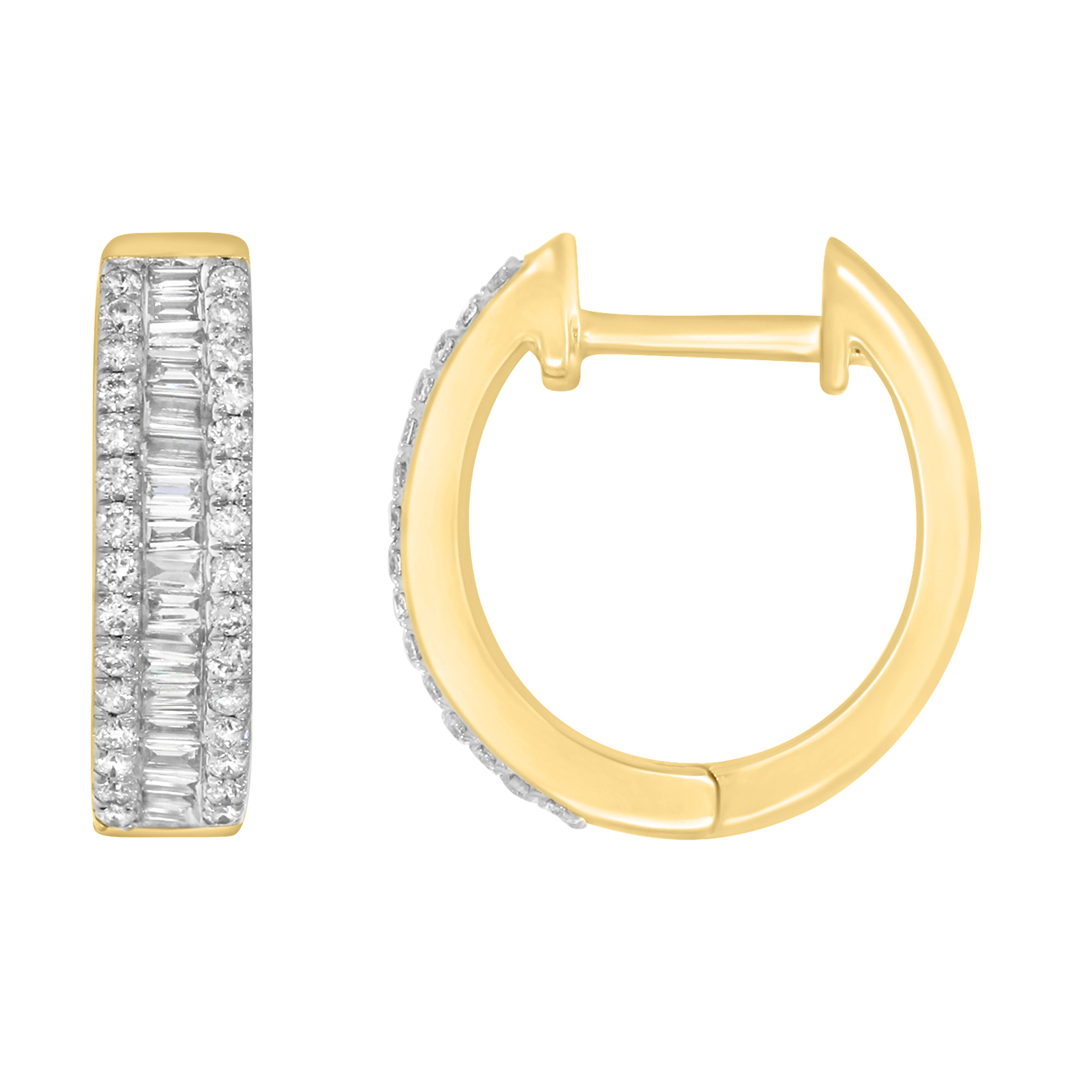 LADIES HOOP EARRINGS 0.75CT ROUND/BAGUETTE DIAMOND 14K YELLOW GOLD