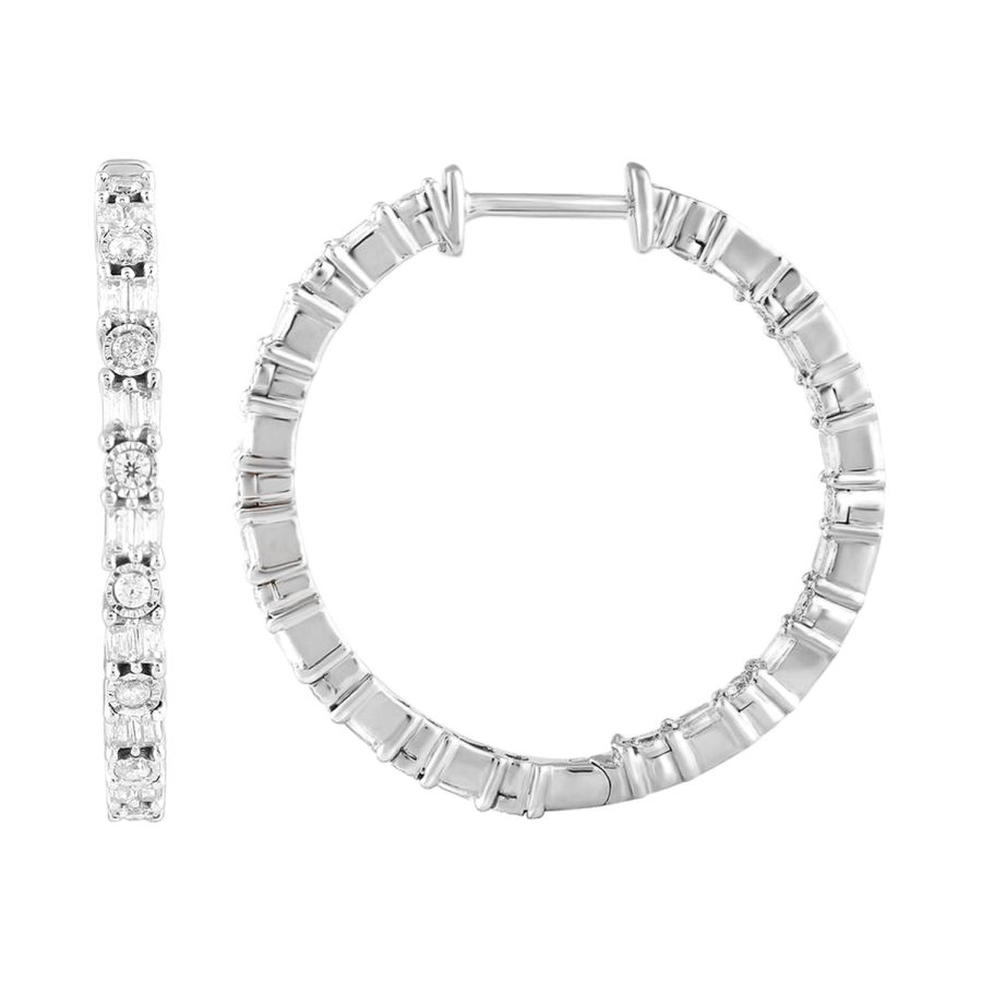 LADIES HOOP EARRINGS 1.00CT ROUND/BAGUETTE DIAMOND 10K WHITE GOLD