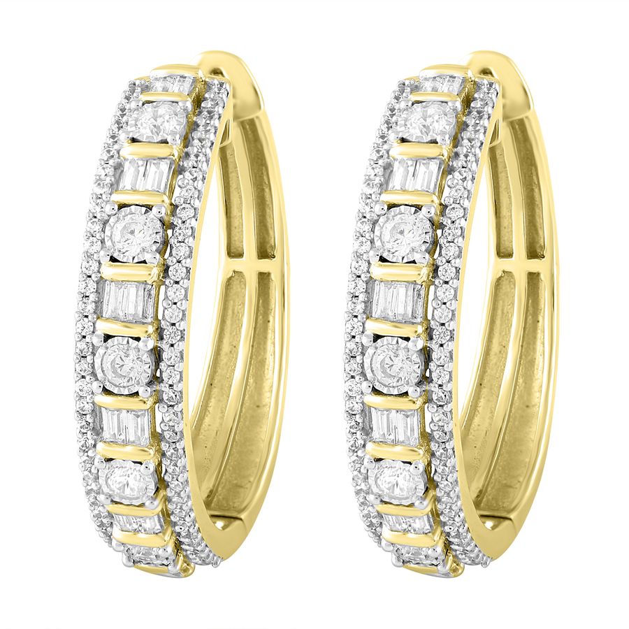 LADIES HOOP EARRINGS 1.00CT ROUND/BAGUETTE DIAMOND 10K YELLOW GOLD