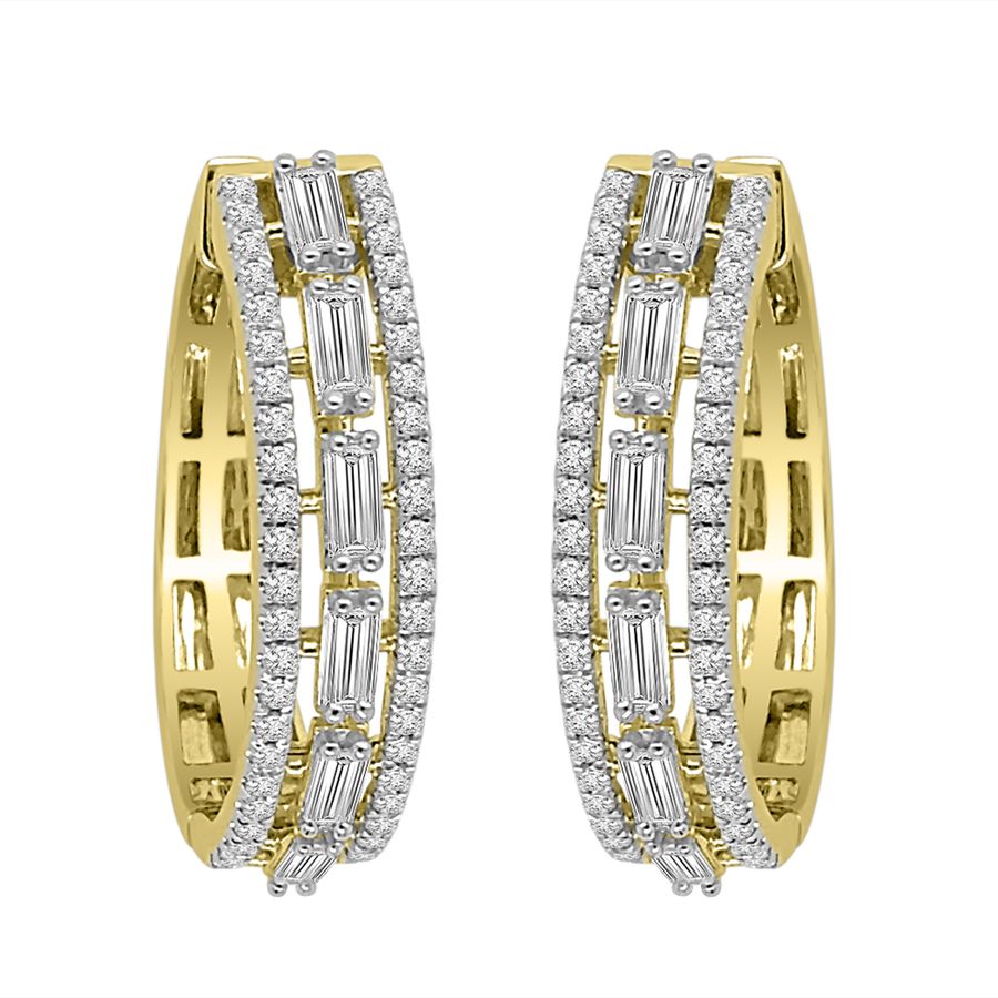 LADIES HOOP EARRINGS 1.00CT ROUND/BAGUETTE DIAMOND 10K YELLOW GOLD