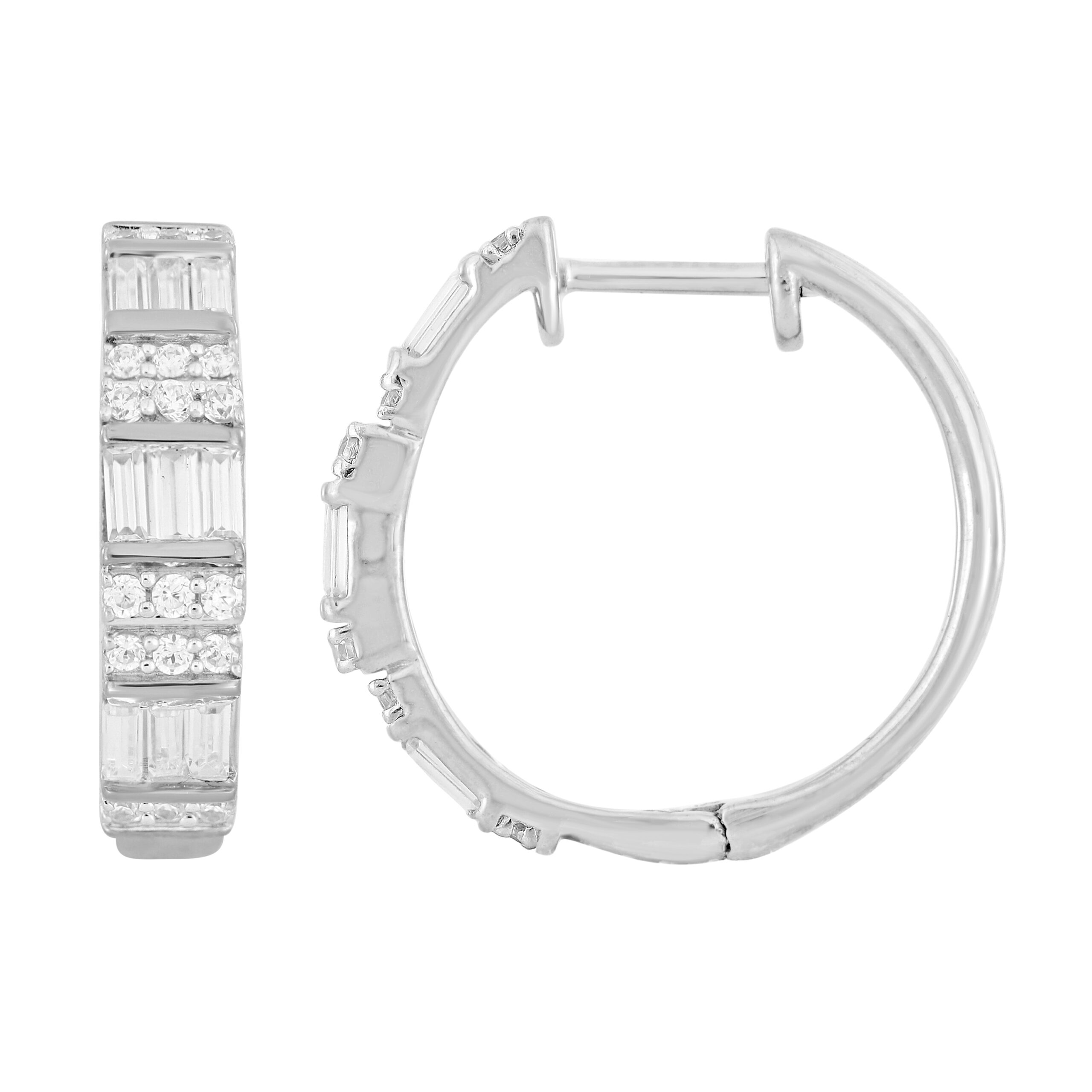 LADIES HOOPS EARRINGS 0.75CT ROUND/BAGUETTE DIAMOND 10K WHITE GOLD