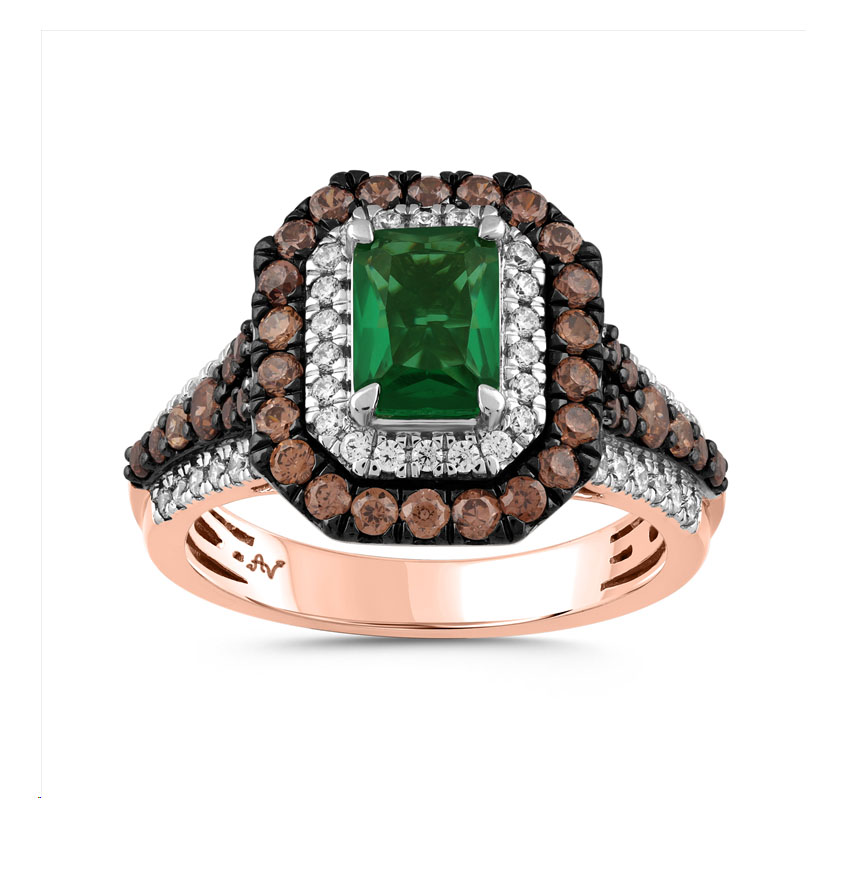 LADIES RING 1.88CT EMERALD/DARK BROWN ROUND DIAMOND 14K ROSE GOLD(CENTER STONE 0.88CT EMERALD DIAMOND)