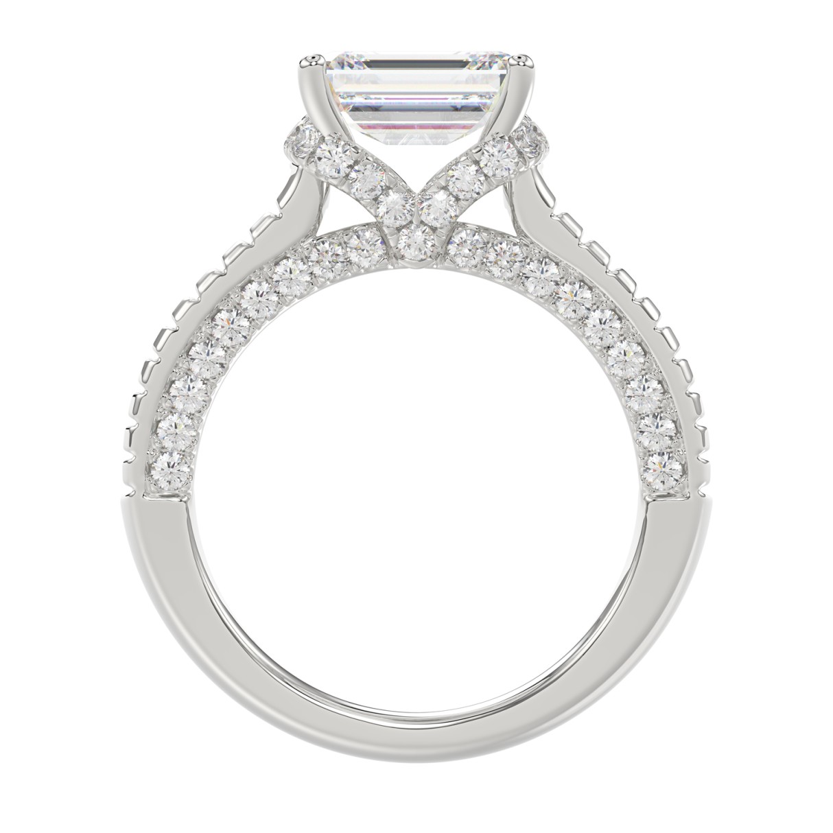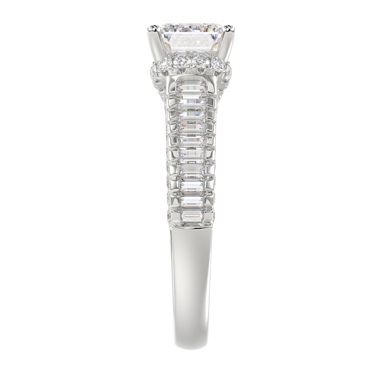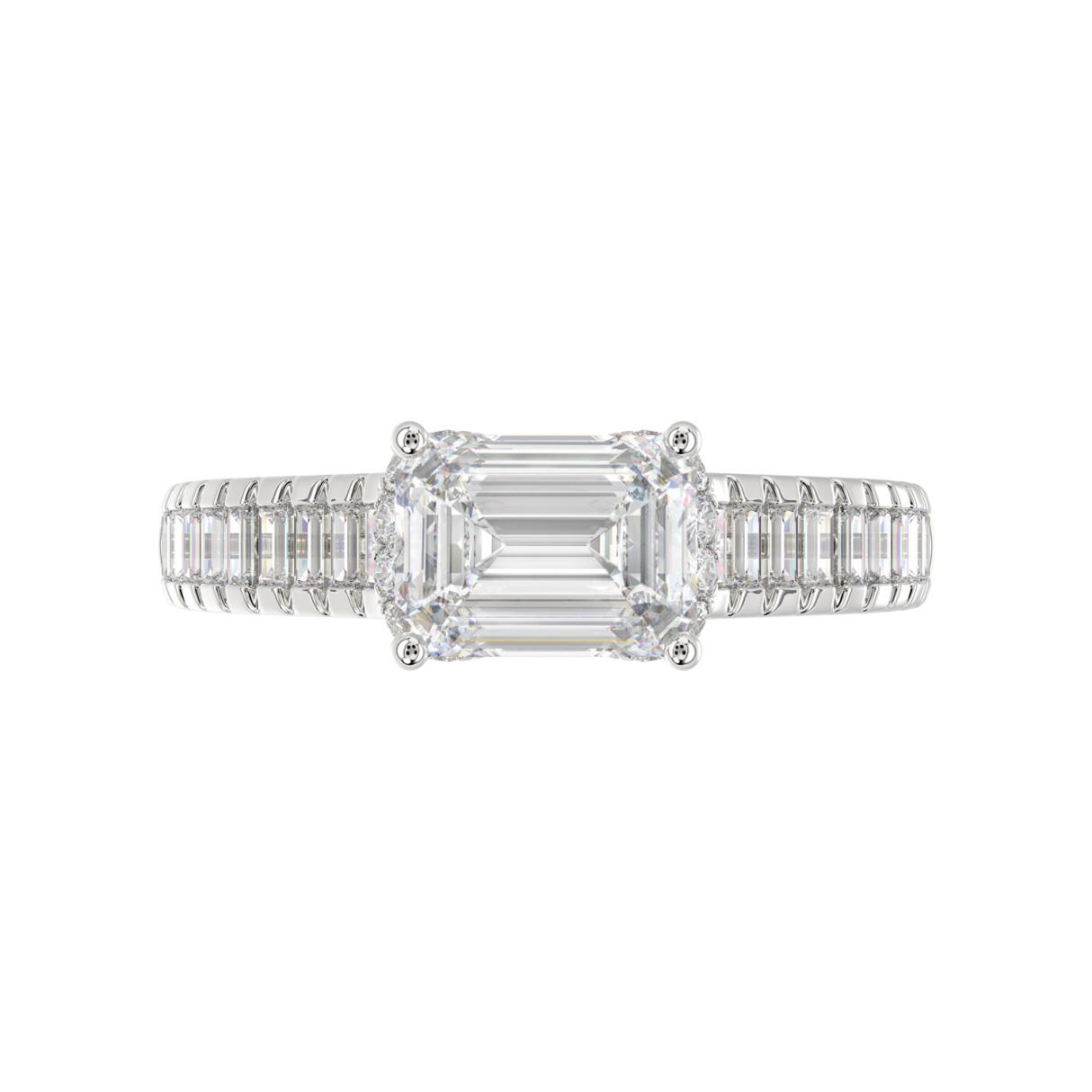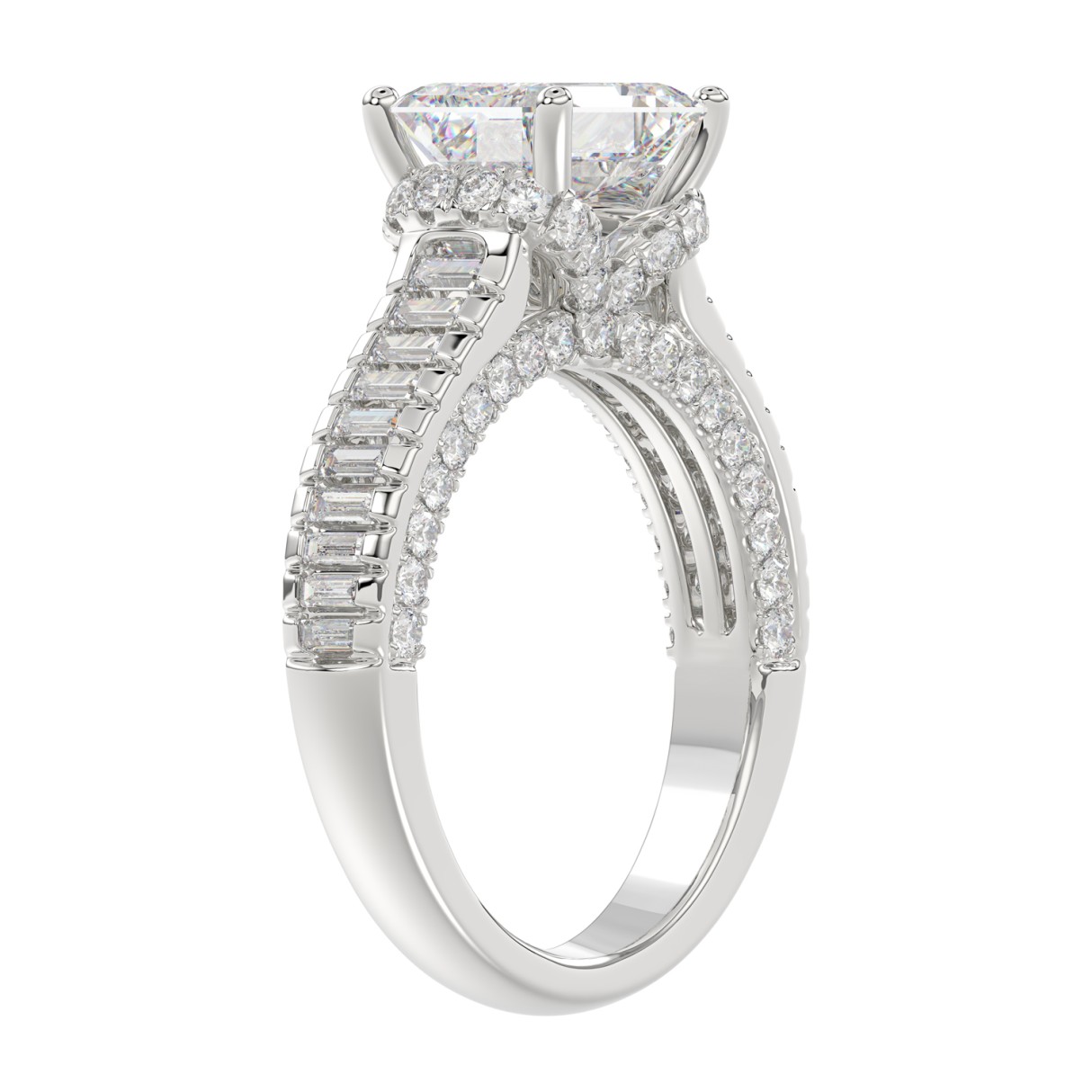 LADIES RING 3CT ROUND/EMERALD/BAGUETTE DIAMOND 14K WHITE GOLD (CENTER STONE EMERALD DIAMOND 2.00CT)