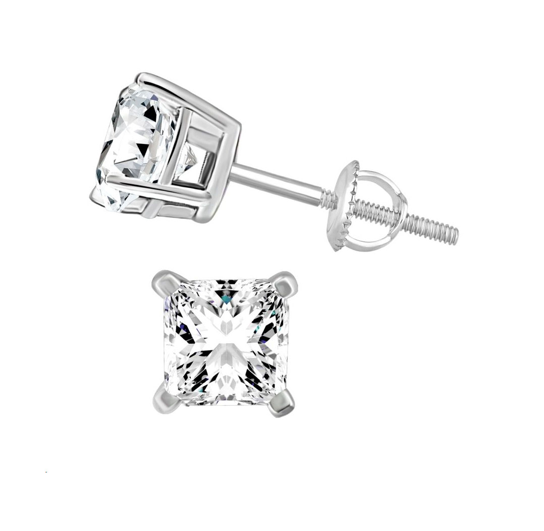 LADIES SOLITAIRE EARRINGS 2.00CT PRINCESS DIAMOND 14K WHITE GOLD