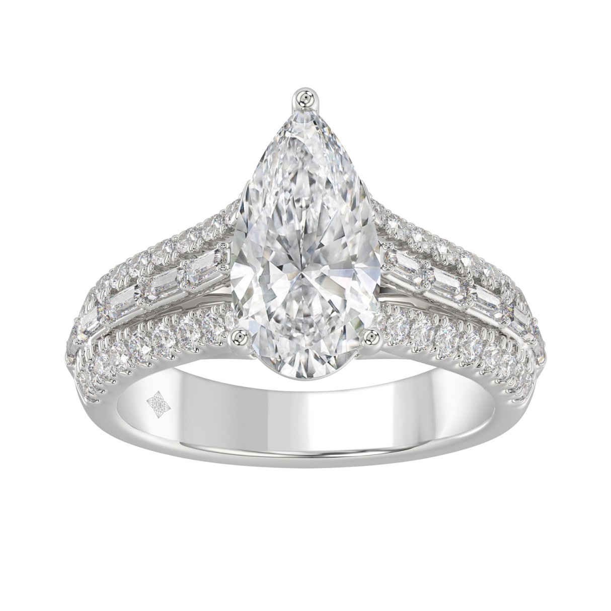 Luxury 14K White Gold Ladies Diamond Ring 2 3/4CT Round Pear & Baguette Diamonds with 2.00CT Pear Center stone (Color F-G -Clarity VS1/VS2)