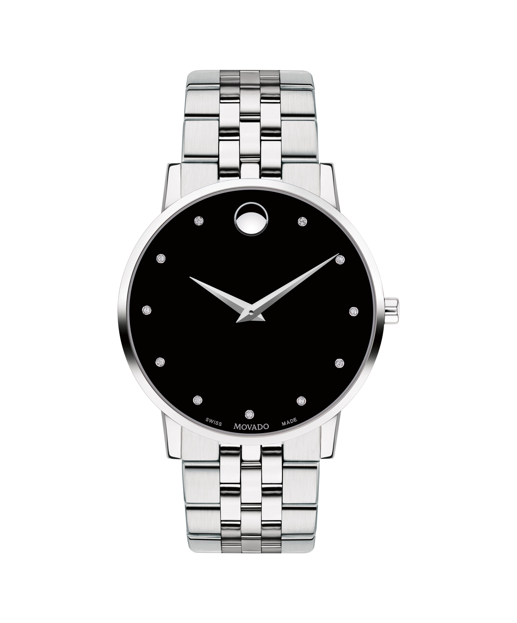 Men’s Museum Classic watch, 40 mm stainless steel case, round black dial with 11 diamond markers (0.043 t.c.w.) and silver-toned dot and hands, stainless steel link bracelet with push-button deployment clasp.