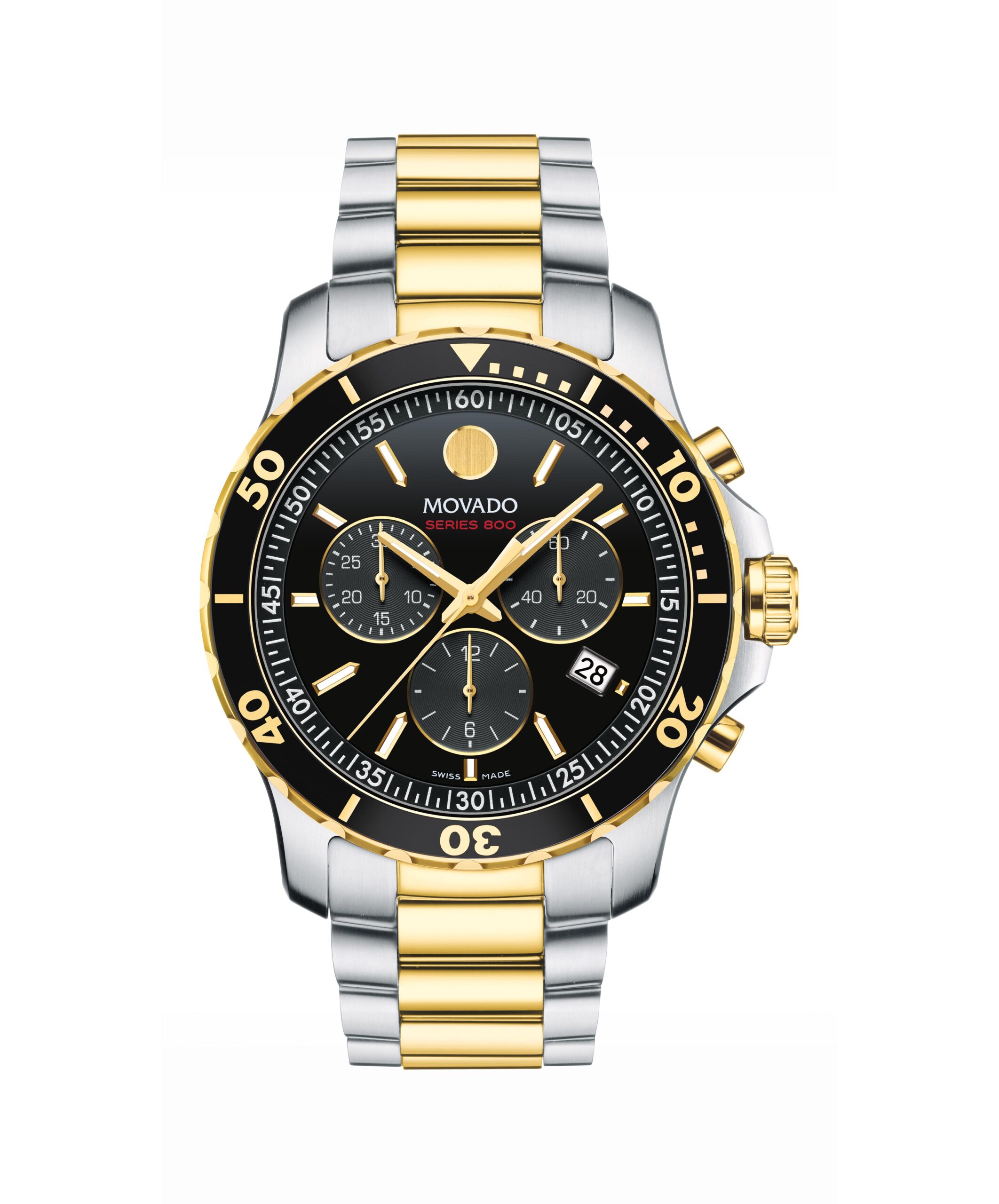 Men’s series 800 watch, 42 mm stainless steel and yellow gold PVD-finished case with black aluminum unidirectional bezel, screw-down crown, round black dial with 3 matching timing subdials, gold-toned signature dot, hands and applied stick markers, printed Arabic minute index, and date display, stainless steel and yellow gold PVD-finished link bracelet with push-button deployment clasp.
